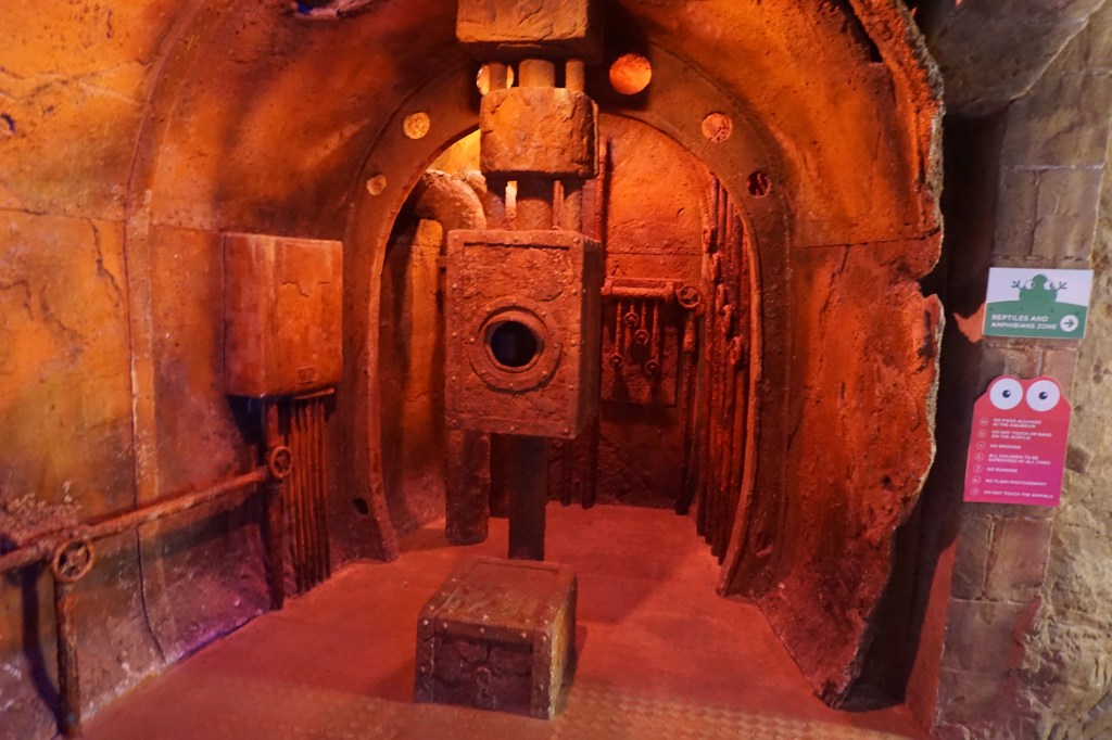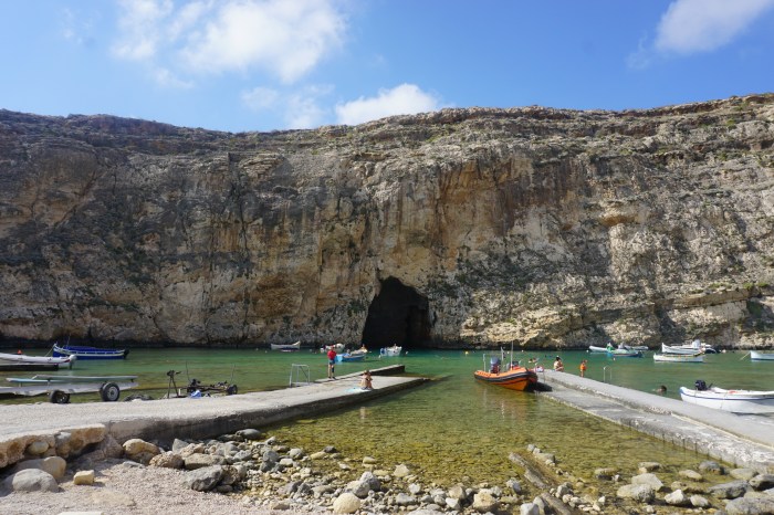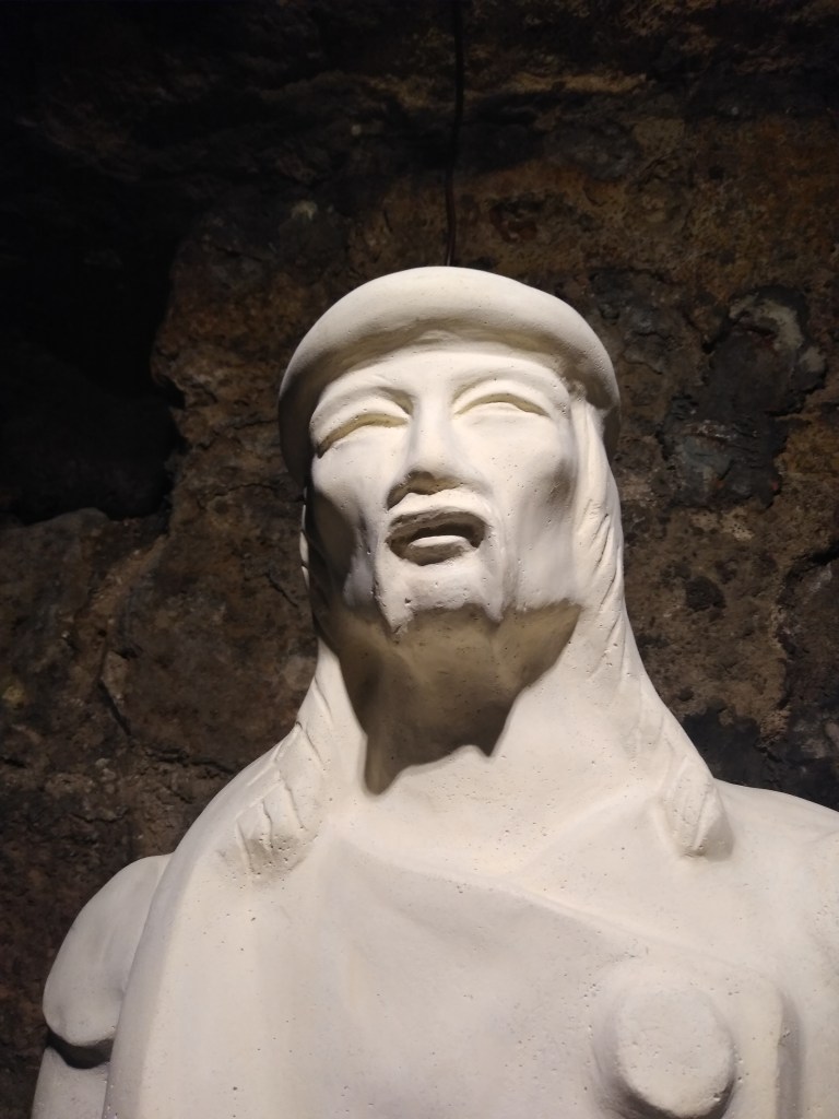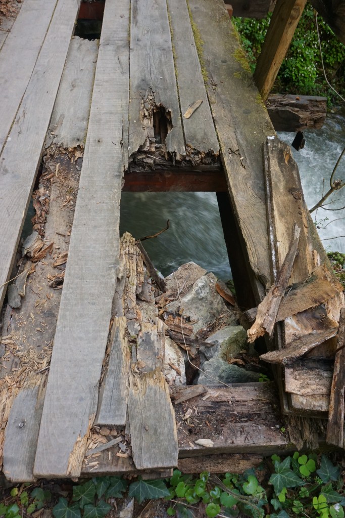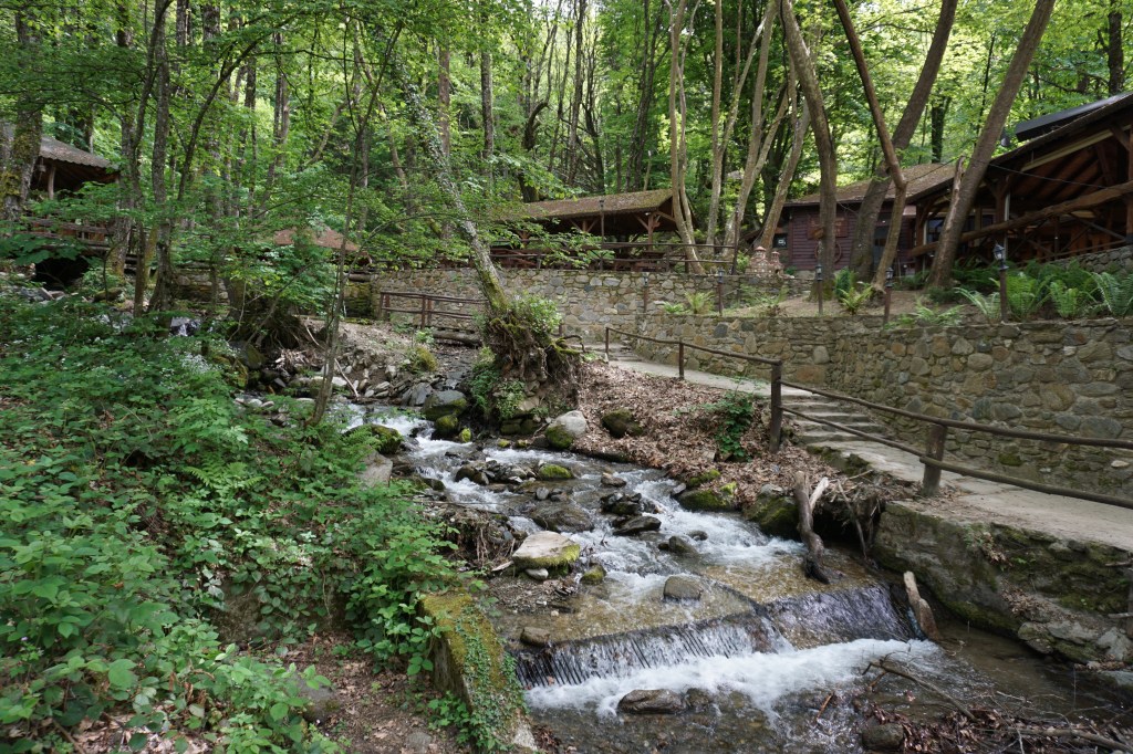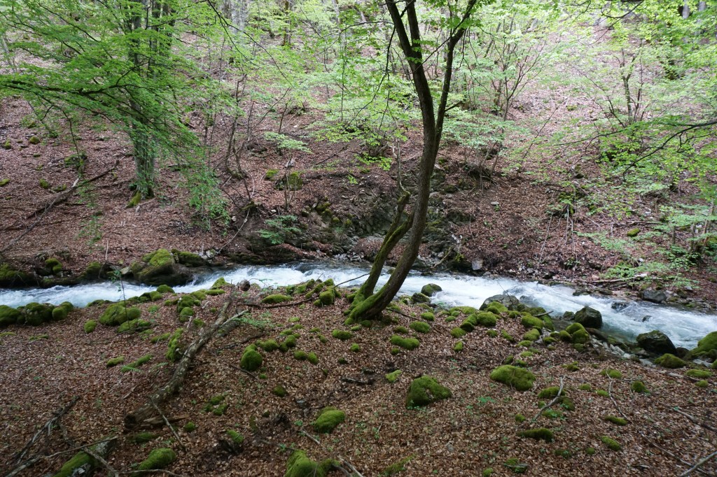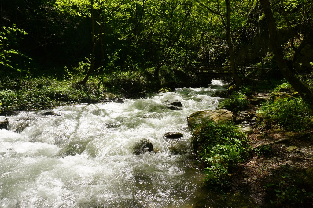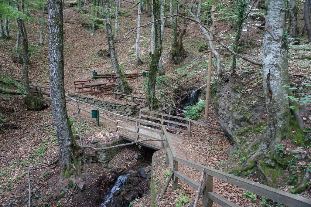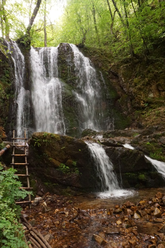 Następne 500 metrów wiodące do wodospadu przebywamy po kładkach, leśną dróżką, napotykamy też kolejną jaskinię na lądzie. Ta jednak jest głęboka, wydaje się idealną kryjówką dla zwierzęcia nawet pokroju niedźwiedzia, więc tylko zerknęliśmy do środka i szybko się wycofaliśmy. W maju dojście do wodospadu jest wręcz niemożliwe, poziom wody jest za wysoki i dróżka w pewnym momencie zanika, mimo że dalej widzimy kładki, po których zwykle można przejść. Tutaj wypadałoby przyjechać w okolicach wakacji dla lepszego efektu.