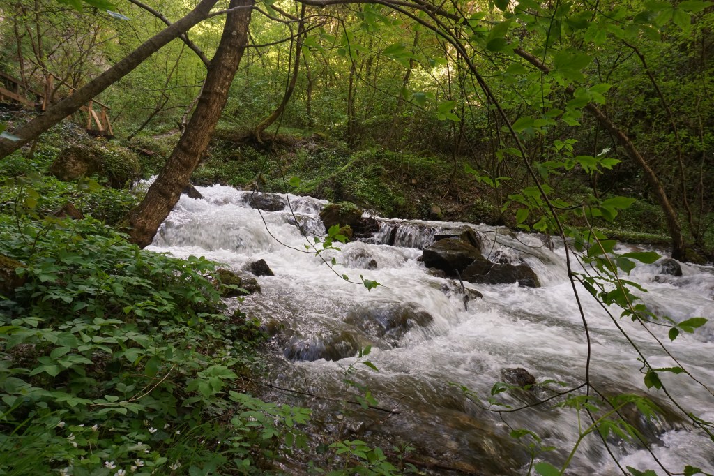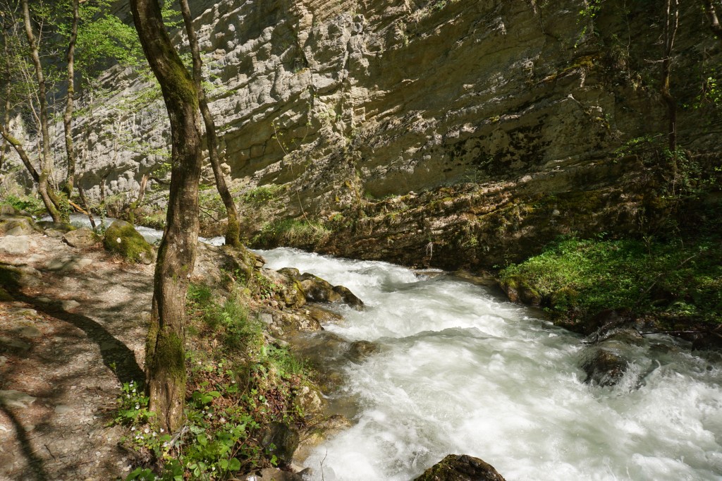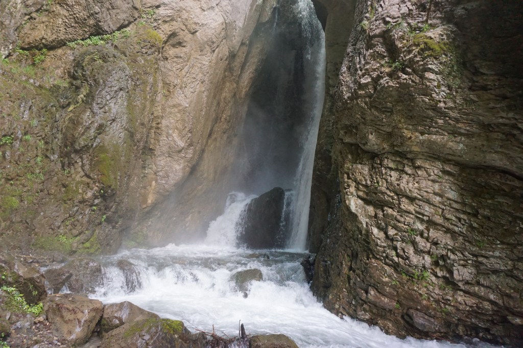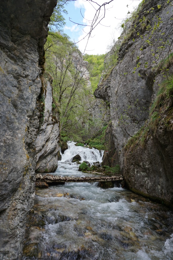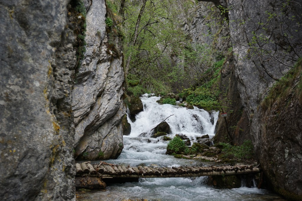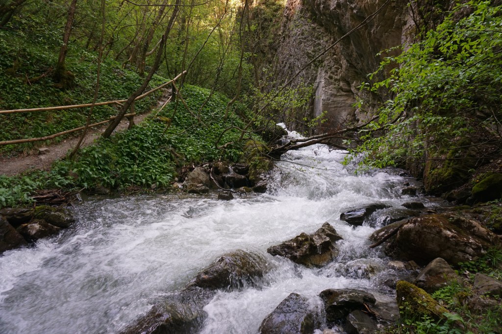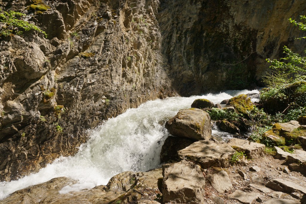 Podejście do atrakcji jest bardzo łagodne – najpierw idziemy ścieżką pomiędzy przerzedzonymi drzewami, z widokiem na imponujące, wysokie skały. Wokół jest mnóstwo kwiatów, do przejścia mamy też kilka mniejszych strumyczków, a za nimi już cały czas idziemy wzdłuż rwącego potoku, który prowadzi nas do celu. Warto udać się tutaj w maju, ponieważ ze względu na obecność wysokich szczytów możemy trafić na roztopowe wodospady i nam udało się jeden uchwycić, nawet pisałam o nim TUTAJ.