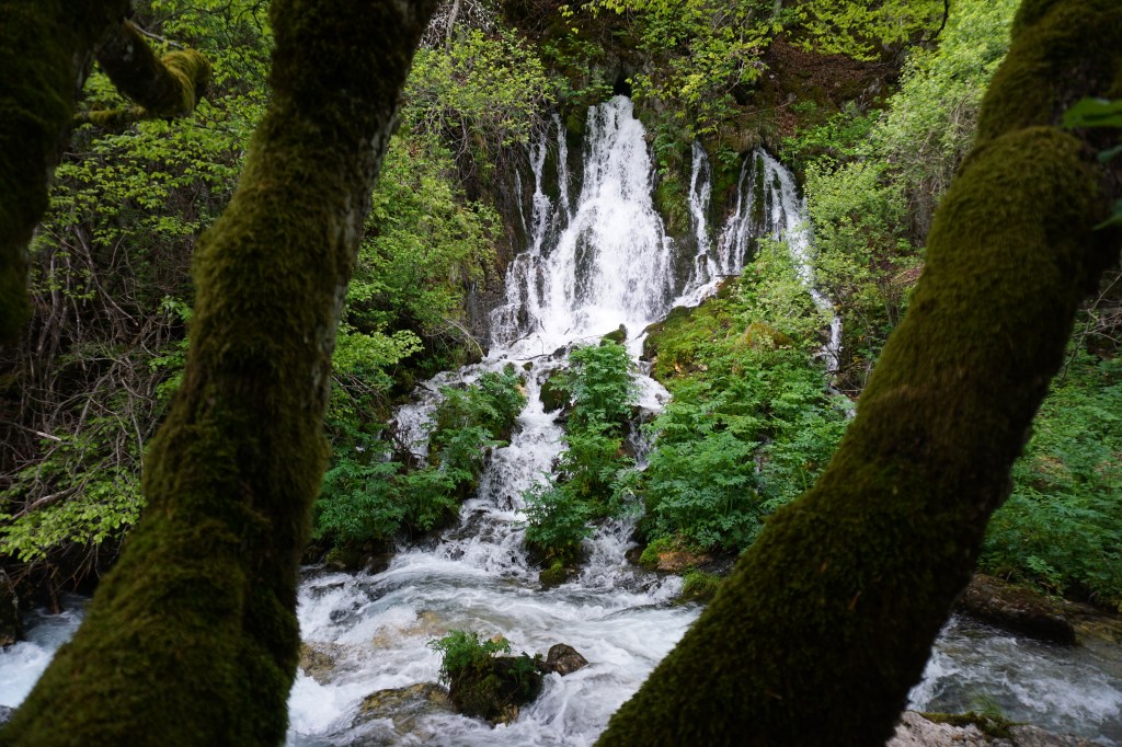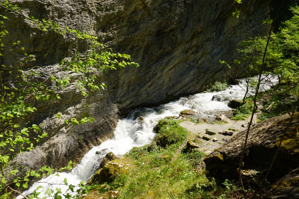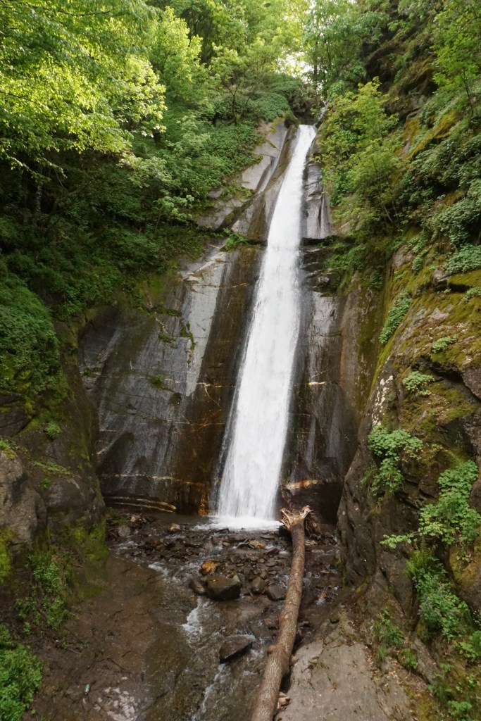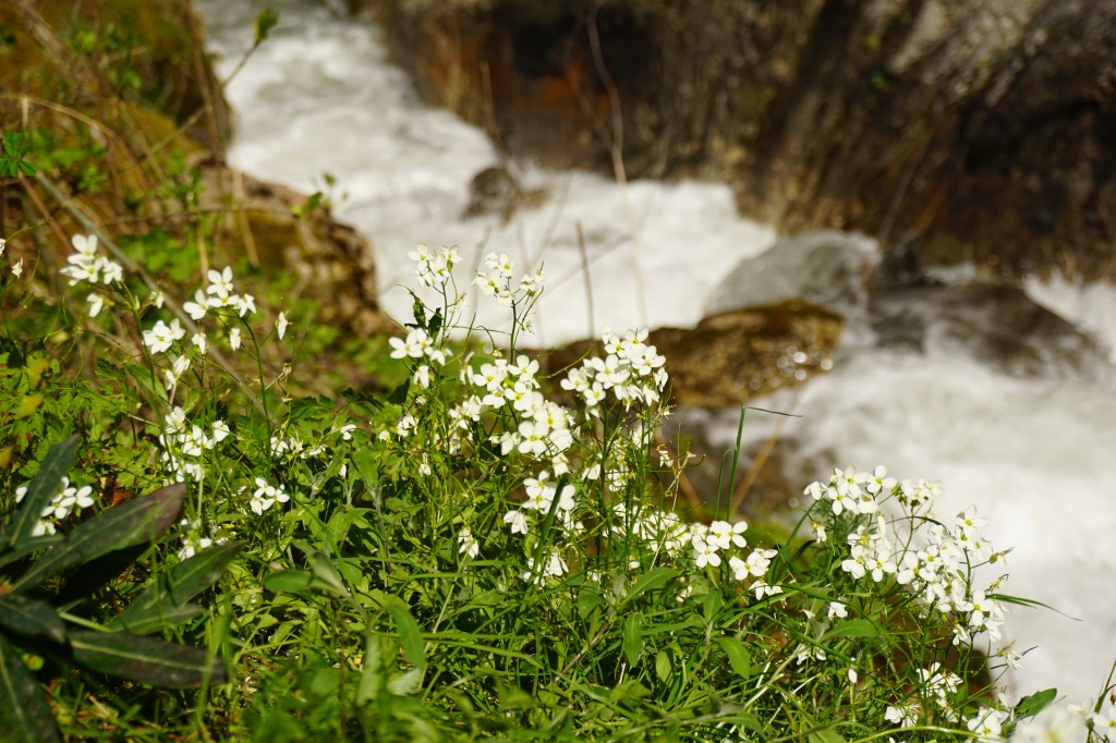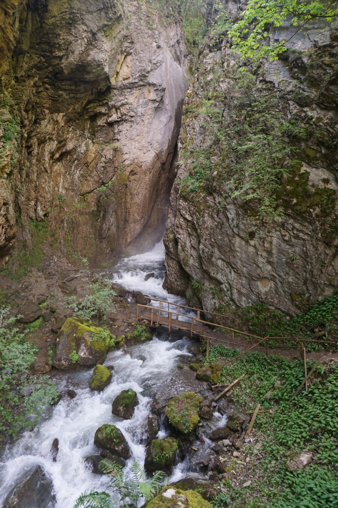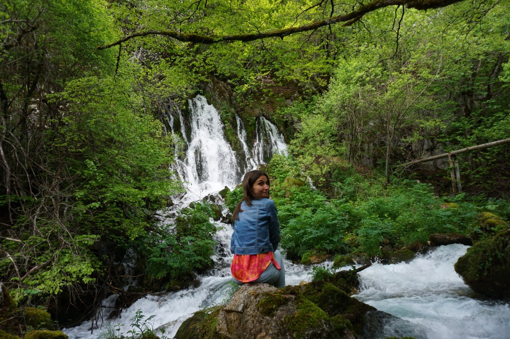 Podejście do atrakcji jest bardzo łagodne – najpierw idziemy ścieżką pomiędzy przerzedzonymi drzewami, z widokiem na imponujące, wysokie skały. Wokół jest mnóstwo kwiatów, do przejścia mamy też kilka mniejszych strumyczków, a za nimi już cały czas idziemy wzdłuż rwącego potoku, który prowadzi nas do celu. Warto udać się tutaj w maju, ponieważ ze względu na obecność wysokich szczytów możemy trafić na roztopowe wodospady i nam udało się jeden uchwycić, nawet pisałam o nim TUTAJ.