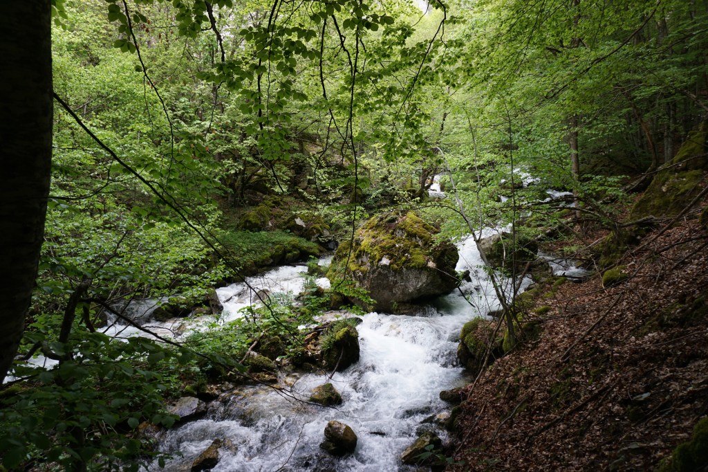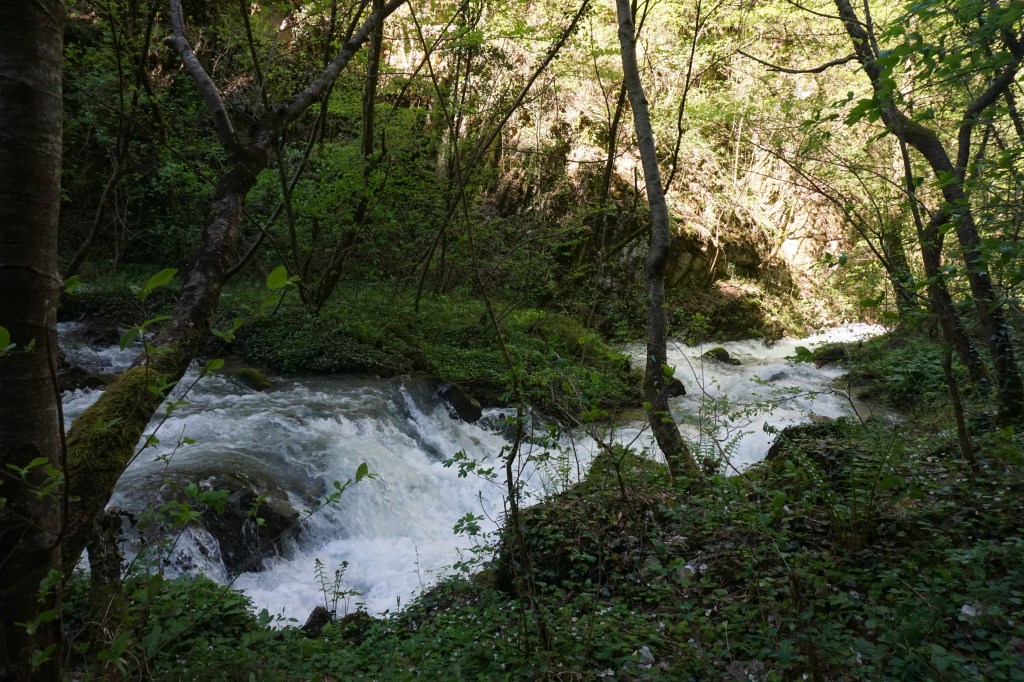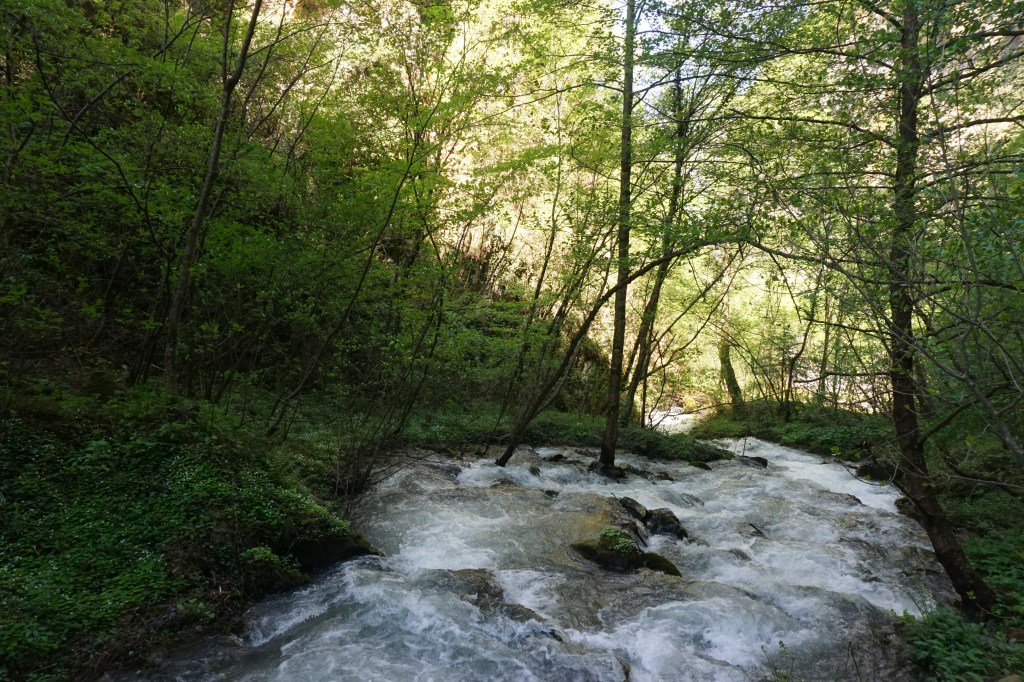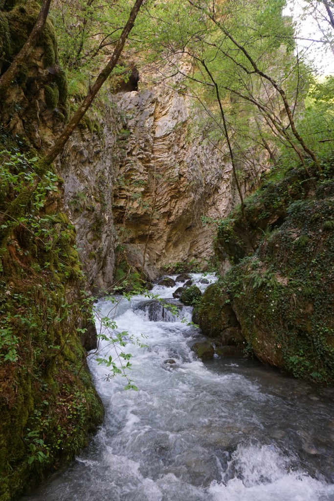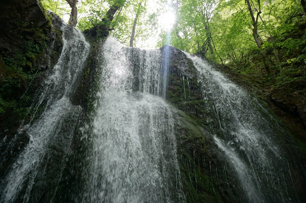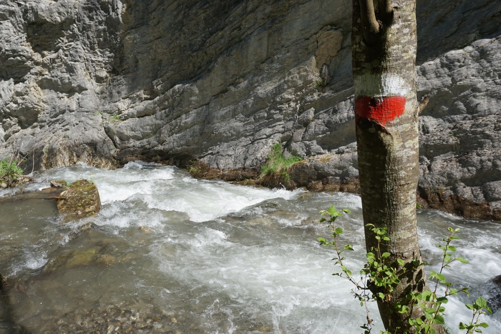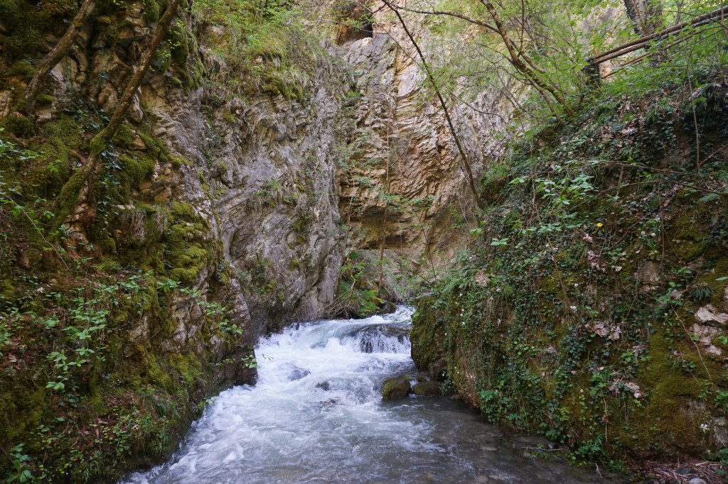 Podejście do atrakcji jest bardzo łagodne – najpierw idziemy ścieżką pomiędzy przerzedzonymi drzewami, z widokiem na imponujące, wysokie skały. Wokół jest mnóstwo kwiatów, do przejścia mamy też kilka mniejszych strumyczków, a za nimi już cały czas idziemy wzdłuż rwącego potoku, który prowadzi nas do celu. Warto udać się tutaj w maju, ponieważ ze względu na obecność wysokich szczytów możemy trafić na roztopowe wodospady i nam udało się jeden uchwycić, nawet pisałam o nim TUTAJ.