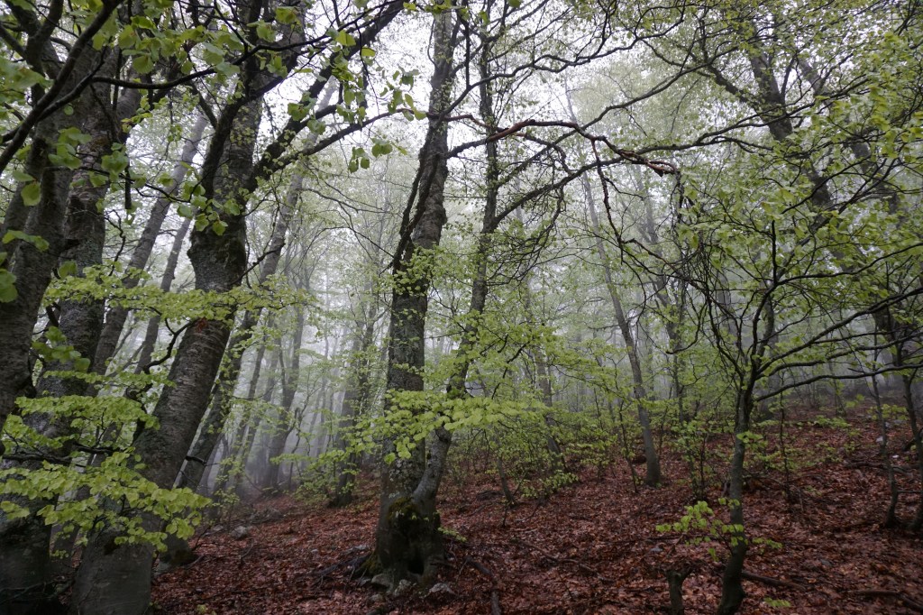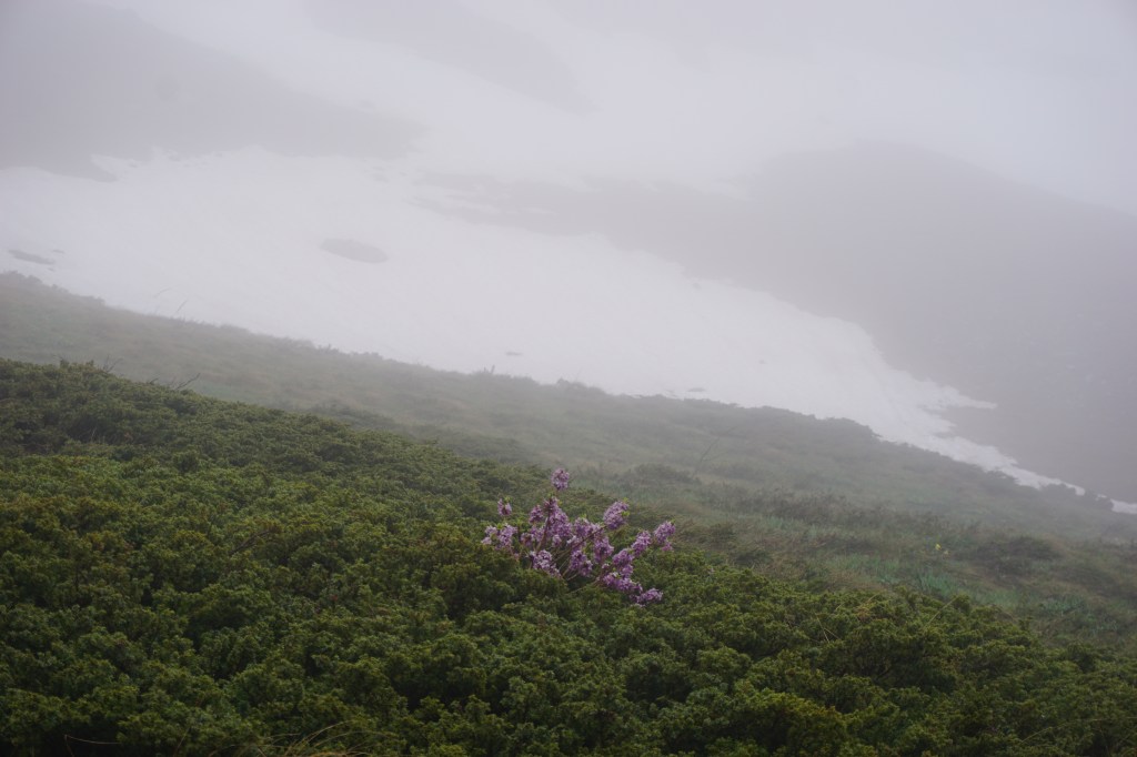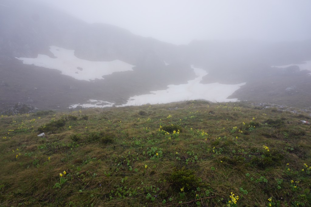 Przez długi czas nie natrafiliśmy nawet na odrobinę śniegu, następną zmianą była dopiero mgła, którą odsłoniły drzewa. Z początku dość rzadka, bliżej szczytu ograniczała widoczność na jakieś 10-20 metrów. Potem zaczął się śnieg, ale nie tak, że tam troszkę – po prostu nagle leżało go dużo, ale jeszcze na tyle, że człowiek był w stanie iść poboczem wzdłuż głównej ścieżki. Chwilę później już nawet to nie wystarczało, więc szliśmy, na początku ślizgając się bez większego pomysłu. W końcu zaczęliśmy wbijać buty w śnieg samymi czubeczkami i to przyniosło efekty. Motywowało nas wyłącznie, że po tym fragmencie znów rozpoczynała się zieleń i to nawet z przebłyskiem kwiatów. W każdym razie tam dało się iść.