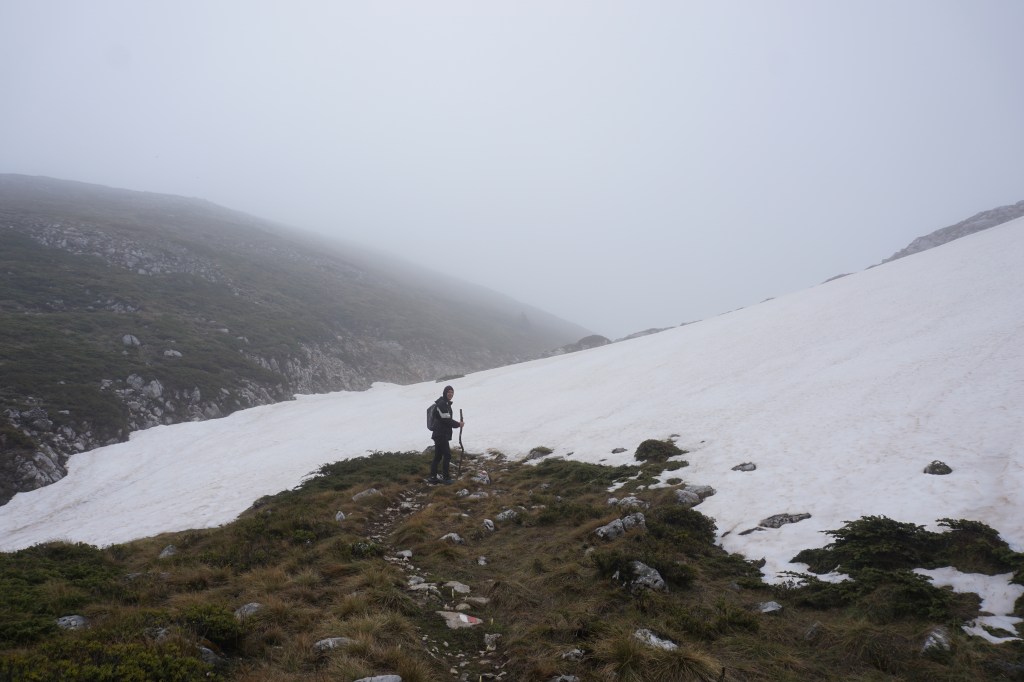 Najgorzej zrobiło się, gdy zaczął padać śnieg, a mgła się zagęściła. Do szczytu zostało jakieś 200 merów, ale zaczął znikać nam z oczu szlak i szukanie jednego oznaczenia zajęło nam koło 40 minut. Nie ma tam żadnych drzew i stwierdzono, że idealnym pomysłem będzie umieszczenie flag na kamieniach, na ziemi, którą teraz grubą warstwą pokrywał śnieg. Gdyby nie to, pewnie doszlibyśmy na szczyt, bo ja mam upór osła, a Szymon zapala się szybko jak zapalniczka na takie wędrówki, ale odezwała się w nas zdroworozsądkowość i się wycofaliśmy. Wiecie, w pobliżu żadnego numeru telefonu, nikt nie wiedział, że tam jesteśmy, zero człowieka…