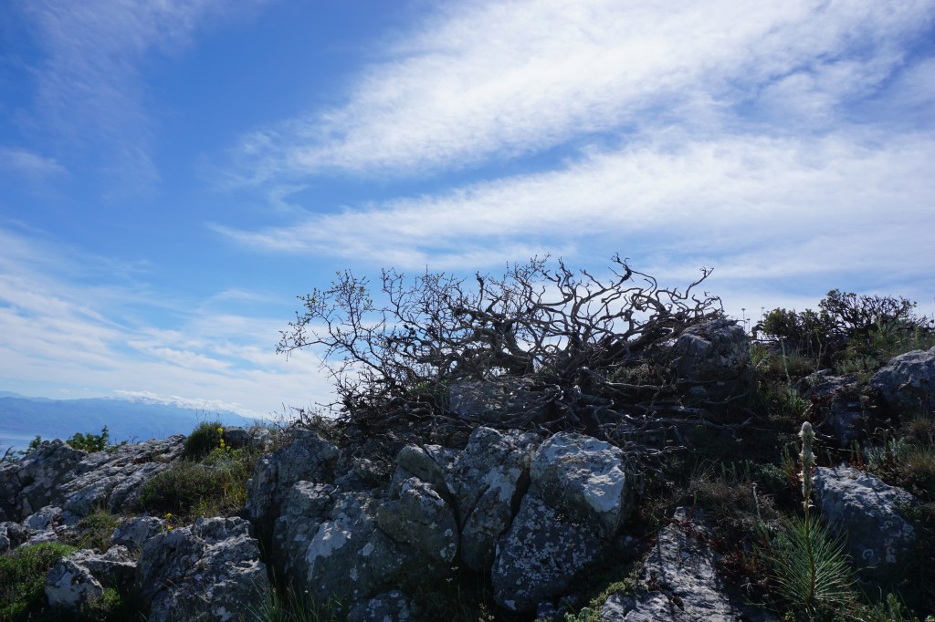 Wracając z powrotem tą samą trasą, po jakichś 40 minutach ujrzymy drogowskaz skierowany w górę właśnie na Tri Mazi (6 km w jedną stronę). Tak naprawdę problem sprawia może ostatni kilometr, który polega na tym, że spacerujemy już stricte po skałach, a potem grani. Na jej szczycie jest się dość szybko, ale trzeba dodać dodatkowe pół godziny, jeśli chcemy znaleźć się w najwyższym jej punkcie, czyli właśnie na szczycie, z którego wyraźnie widać 3 czubeczki. Tutaj paniom o długich włosach radzę zabrać ze sobą gumkę, bo wiar wieje niemiłosiernie i przez pół drogi albo nic nie widziałam, albo chwytałam włosy ręką, drugą się asekurując, co nie było specjalnie wygodne. Długie, grubsze spodnie również są tutaj atutem, bo na grani jest mnóstwo kłujących roślin. Jeśli jednak nie chcecie, żeby było Wam za gorąco, to ukłucia są znośne, choć częste.