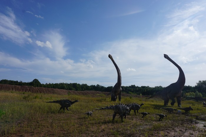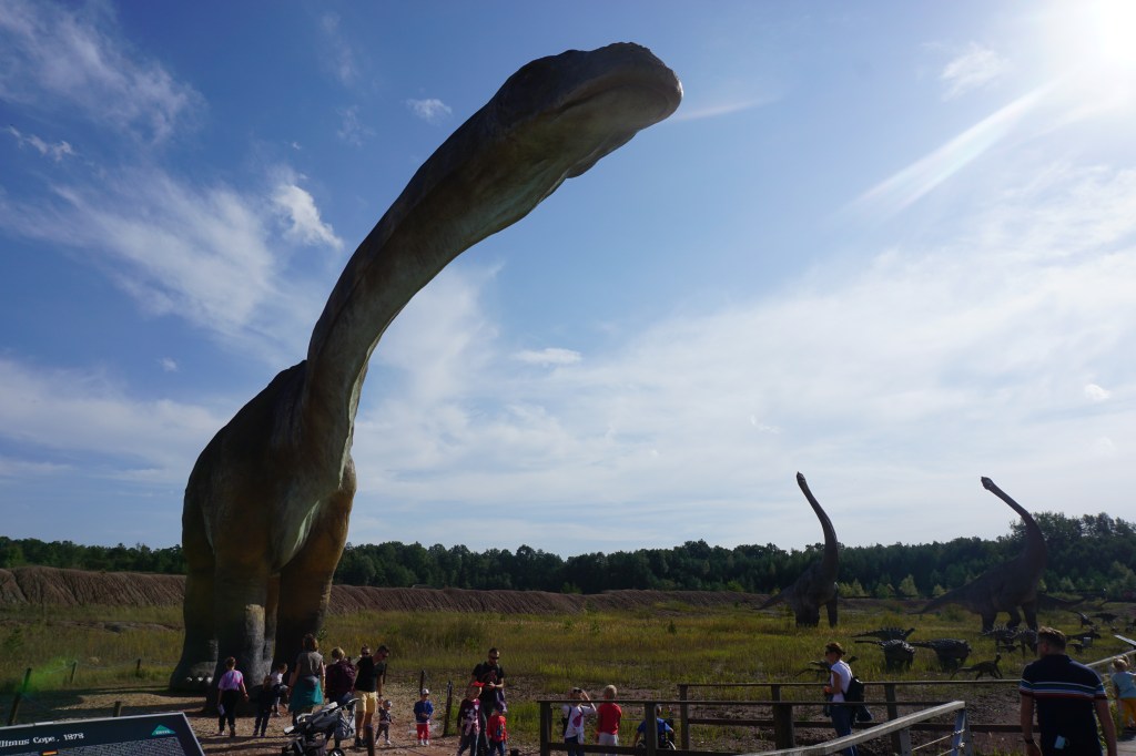 Eksponaty mają rzeczywiste rozmiary, chociaż czasem, zwłaszcza spoglądając na tablice informacyjne, można dostrzec pewne odstępstwa od reguły. Jak się jednak można domyślić, byliśmy jednymi z niewielu osób, które rzeczywiście wczytywały się w tekst – rodziny z dziećmi raczej obwieszczały na głos nazwę danego dinozaura, robiły zdjęcie i szły dalej. Szkoda, bo tablice są dość ciekawe, przynajmniej niektóre. Zazwyczaj zawierają sporo ciekawostek i rozważań, oprócz tego tłumaczą zastosowanie nietypowych części ciała stworzeń. Znajdują się na nich także rysunki przyrównujące wielkość człowieka do wielkości danego dinozaura, jego sposób pożywiania, kraj występowania, wzrost i waga, które czasem okazywały się zaskakujące. Z rozbawieniem dostrzegliśmy, że niektóre okazy wagowo były mniejsze od mojego ogromnego kota! Graliśmy też w grę, która polegała na tym, że zakładaliśmy, który dinozaur mógł przekształcić się w jakieś współczesne zwierzę i jakie.