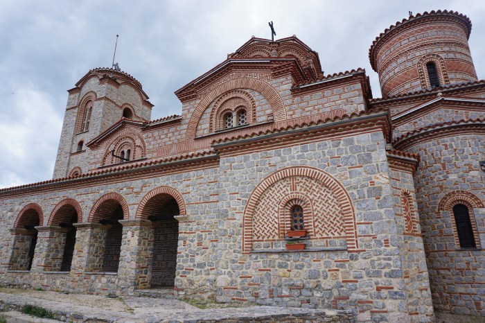 Jeden z ciekawszych obiektów o charakterze sakralnym – powstał w IX wieku, ale jego forma ulegała licznym przekształceniom aż do renowacji w roku 2002. Wyobrażenie pierwowzoru daje nam dolna część cerkwi Pantalejmona, która dość dobrze się zachowała. Budynek wyróżnia się szarą barwą z pomarańczowymi, ceglanymi ozdobnikami. Zwykle całe budowle są raczej brązowo-pomarańczowo-czerwone. To co mnie urzekło, to właśnie te finezyjnie poukładane cegiełki tworzące rozmaite wzory na fasadach – proste rozwiązanie, a efekt bardzo estetyczny. Do środka cerkwi można wejść, ale niestety robienie zdjęć jest zabronione. We wnętrzu znajdziemy niewielki kiosk z figurkami, obrazkami czy książkami, ale też wystawę dopasowanych do siebie fragmentów mozaik i grobowiec, który za życia stworzył dla siebie św. Klemens (założyciel dość mocno rozsławiony w Macedonii). Oprócz tego możemy podziwiać różne malowidła, a do ciekawych rozwiązań optycznych należą też specjalnie ustawione lusterka, dzięki którym możemy oglądać to, co znajduje się pod ziemią. Na nas wnętrze zrobiło duże wrażenie, akurat tego wejścia bym sobie nie odpuszczała.